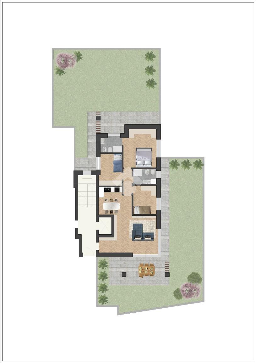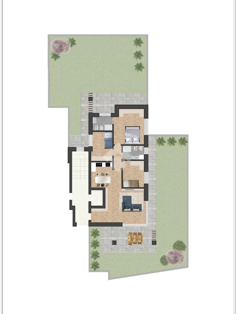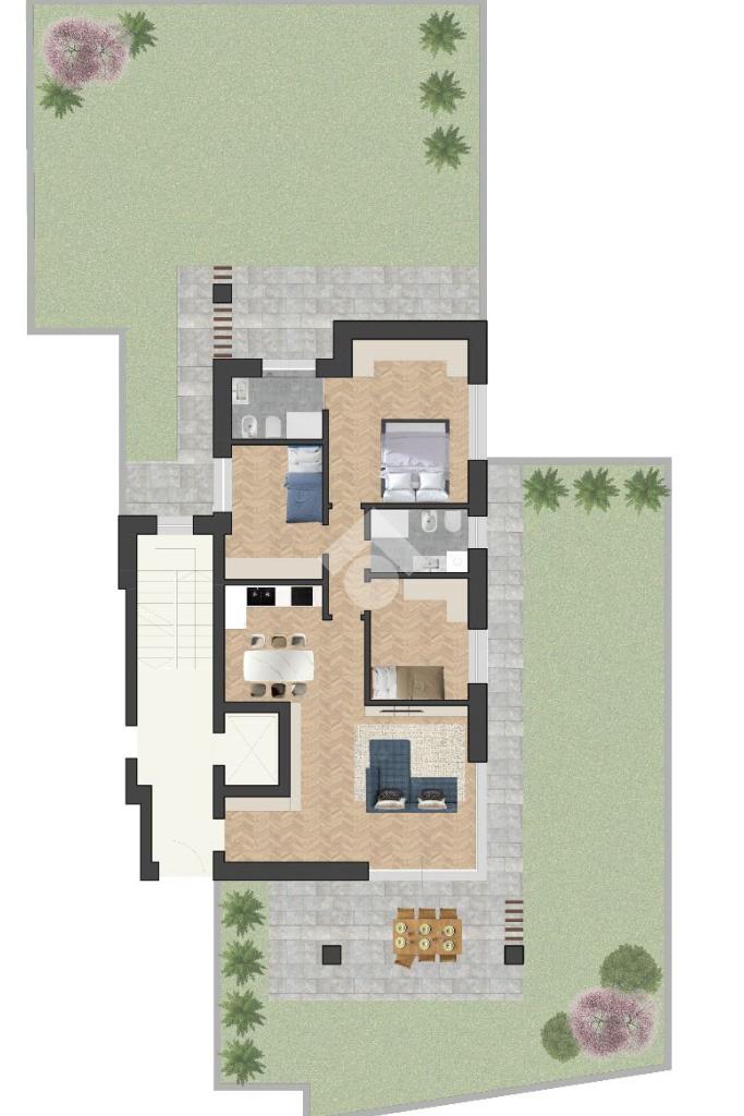 Tutti gli appartamenti sono dotati di ampi spazi esterni vivibili, con terrazze o giardini privati che regalano una suggestiva vista sui vigneti della Franciacorta, per vivere ogni giorno un'esperienza di tranquillità e bellezza.