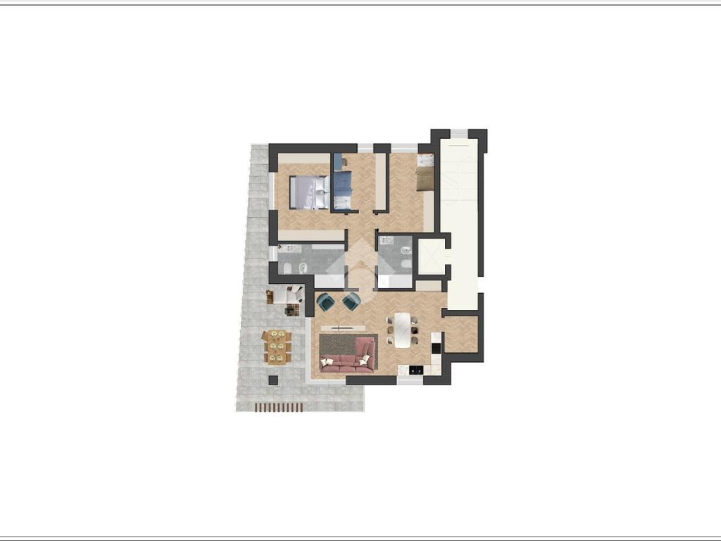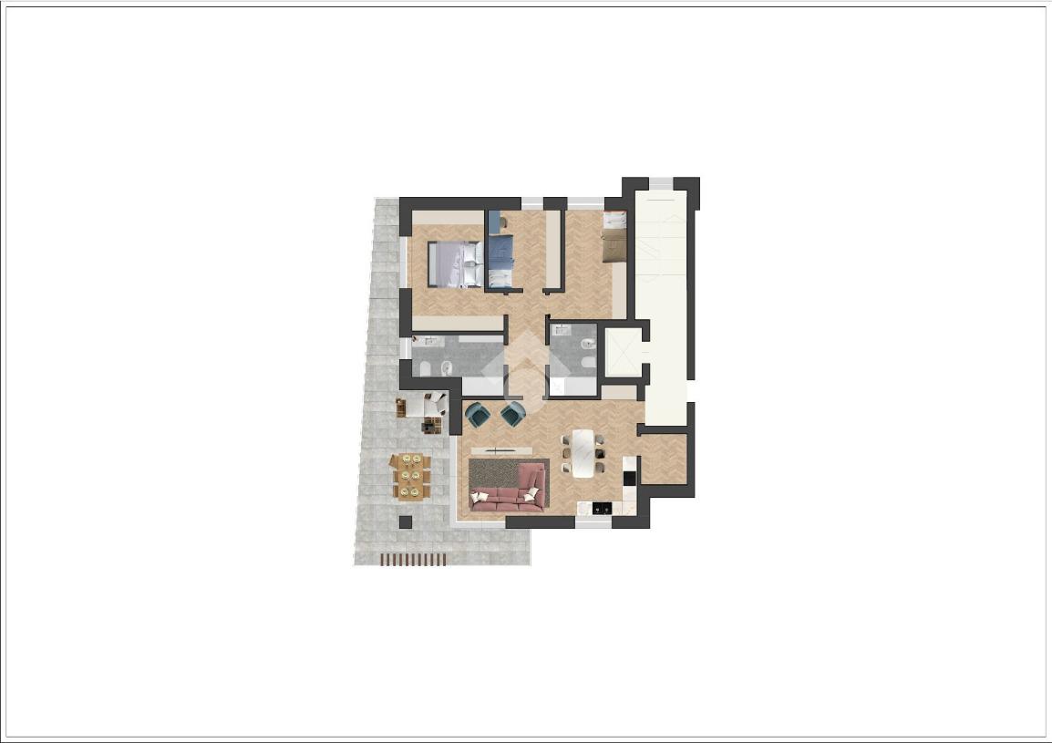 Tutti gli appartamenti sono dotati di ampi spazi esterni vivibili, con terrazze o giardini privati che regalano una suggestiva vista sui vigneti della Franciacorta, per vivere ogni giorno un'esperienza di tranquillità e bellezza.