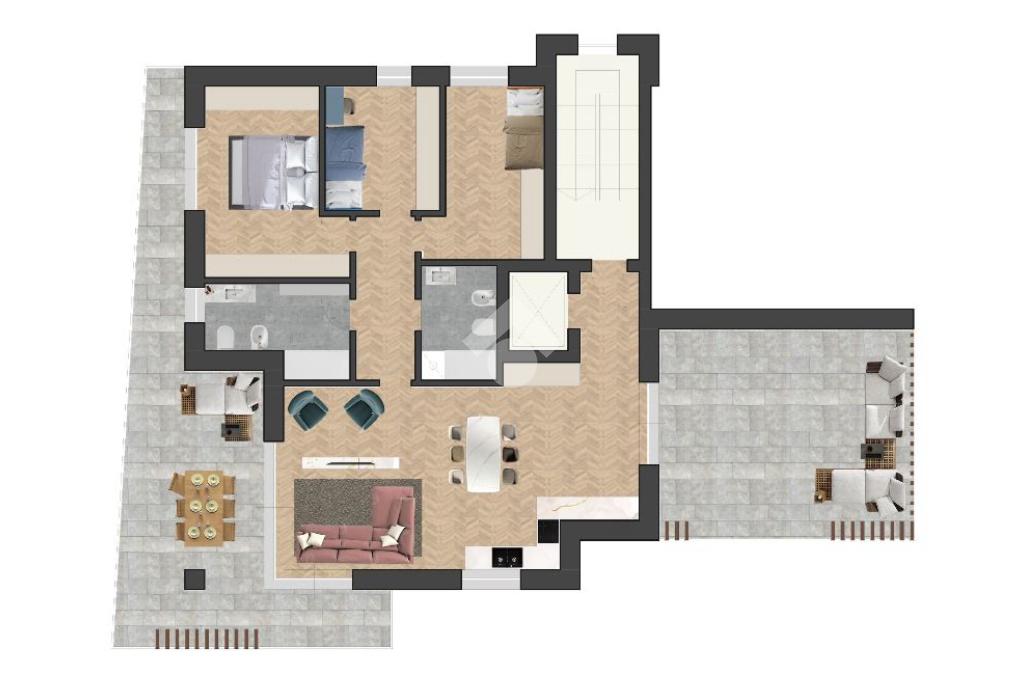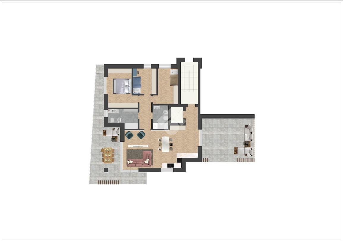 Tutti gli appartamenti sono dotati di ampi spazi esterni vivibili, con terrazze o giardini privati che regalano una suggestiva vista sui vigneti della Franciacorta, per vivere ogni giorno un'esperienza di tranquillità e bellezza.